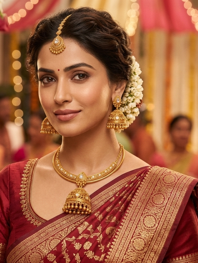Enhance your look with this elegant golden necklace set. Perfect for weddings, festivals, and special occasions.